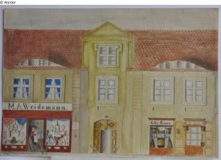 Fundmeldung Potsdam, Laden vor M. A. Weidemann und Böttcherladen der Gebr. Bauer Hersteller/Künstler:in Unbekannt Objektart Aquarell Material / TechnikPapier ; Wasserfarbe / gezeichnet (Feder) ; aquarelliertLost Art-ID484660