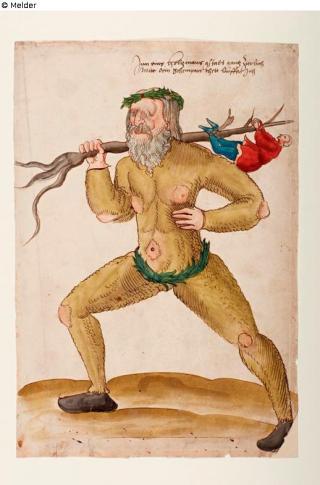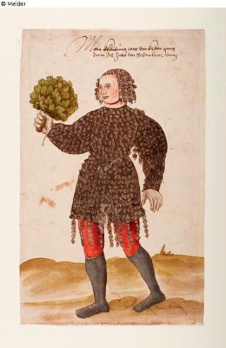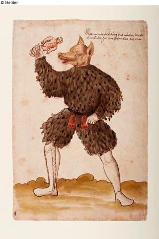 restituiert Fundmeldung Läufer mit Kostüm aus haarigem Fell mit Wolfskopf Hersteller/Künstler:in Unbekannt Objektart Aquarell Material / TechnikWasserfarbe / aquarelliert ; gehöht gold ; gezeichnet (Feder...Lost Art-ID568274