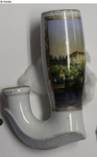 Fundmeldung Tabakspfeifenkopf mit dem Schloss Hohentübingen, dem Neckar und der Neckarhalde Hersteller/Künstler:in Unbekannt Objektart Kunsthandwerk / -gewerbe Material / TechnikKeramik (Porzellan)Lost Art-ID578003