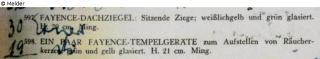 Suchmeldung Fayence-Dachziegel: Sitzende Ziege Hersteller/Künstler:in Unbekannt Objektart Kunsthandwerk / -gewerbe Material / TechnikKeramik (Ton) ; Glasur (Fayence) weißlich gelb, grünLost Art-ID582808