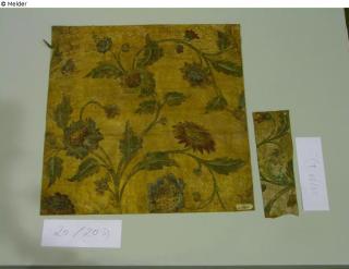 Fundmeldung Goldledertapete mit Blumenranken und Vogelmotiv Hersteller/Künstler:in Unbekannt (Flandern) Objektart Kunsthandwerk / -gewerbe Material / TechnikLeder gold ; Lack gold / punziert ; bemaltLost Art-ID620725