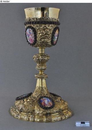 Fundmeldung Messkelch Hersteller/Künstler:in Unbekannt (Böhmen) Objektart Gefäß Material / TechnikMetall (Silber) ; Emaille ; Granat [mehrere] / goldplattiert...Lost Art-ID626814