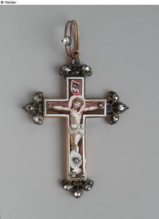 Fundmeldung Brustkreuz, Anhänger Hersteller/Künstler:in Unbekannt (deutsch) Objektart Schmuck Material / TechnikMetall (Silber) ; Emaille ; Textil (Seide) ; Stein [mehrere]Lost Art-ID626815