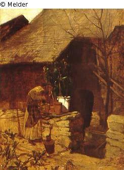 restituiert Fundmeldung Frau mit Topfpflanzen vor Bauernhaus / Frau am Brunnen / Frau mit Blumen Hersteller/Künstler:in Pettenkofen, August Xaver Karl von (Ritter) Objektart Gemälde Material / TechnikÖl ; Holz / gemaltLost Art-ID237804