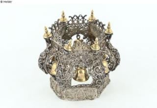 Fundmeldung Tora-Aufsatz (Rimon) Hersteller/Künstler:in Unbekannt Objektart Ritualgegenstände und Zubehör Material / TechnikMetall (Silber) / Filigranarbeit ; teilvergoldetLost Art-ID634119