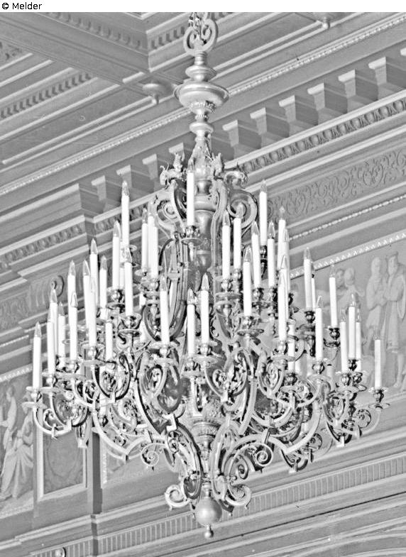 Zunächst wurde 1896 nur ein Kronleuchter mit 42 Kerzen von der Firma K. M. Seifert & Comp. auf elektrische Beleuchtung umgerüstet, wie die erhaltene Rechnung vom 31.07.1896 beweist. Dieser erhielt zusätzlich zu den bereits vorhandenen 42 Brennstellen weitere „24 Bronzearme“ an denen die „Montage von 24 Glühlampen“ erfolgte. Die zweite Rechnung derselben Firma vom 26.09.1896 belegt die Umstellung der anderen „9 Kronen von je 42 Wachskerzen… zu electrisch Licht eingerichtet“. Zusätzlich werden an allen neun Kronleuchtern „weitere 24 Fassungen und Glühlampen geliefert“ welche man an „24 Bronzearmen“ angebracht hat (damit insgesamt 66 Brennstellen nach Elektrifizierung). Die Hinweise auf das „Aufpolieren der Kronen“ belegt, dass die Kronleuchter keine feuervergoldeten Oberflächen gehabt haben. Vielmehr dürfte es sich um leicht oxidierte Messingoberflächen gehandelt haben, die aufpoliert und sicher mit einem Schutzüberzug versehen wurden.