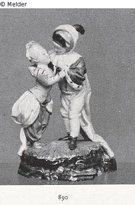 Der Knabe hat seinen rechten Arm um den Nacken des Mädchens gelegt und zieht es an seine Brust. In der linken Hand hält er eine Rotweinflasche. Er trägt beigefarbenen Anzug mit golden gestreifter weißer Schärpe und rote Schuhe, mit Hermelin gefütterten purpurnem Schulterumhang, graublauen schleppenden Mantel und blau gefütterte, golden geränderte weiße Kapuze mit rotem Stutz über golden geränderter schwarzer Kappe; das Mädchen hochdoupiertes Haar, purpurn gestreiftes Schultertuch, türkisgrüne, golden geränderte Jacke, abstehenden geschweiften gelben Rock, purpurne Pumphosen und blaue Schuhe. Grasbodensockel mit dunkel getöntem Felsrand. Reparatur am Hals des Mädchens. Marke: Blaues Rad mit Kurhut.