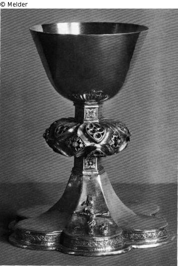 Kelch mit breitem Nodus aus zwölf durchbrochenen Fischblasen. Auf dem Fuß eine in Relief aufgelegte Kreuzigungsgruppe, von der die linke, unter dem Kreuz stehende Figur (Maria) fehlt. Innen am Fuß gravierte Inschrift: "anni din MCCCCLXXXII ..."