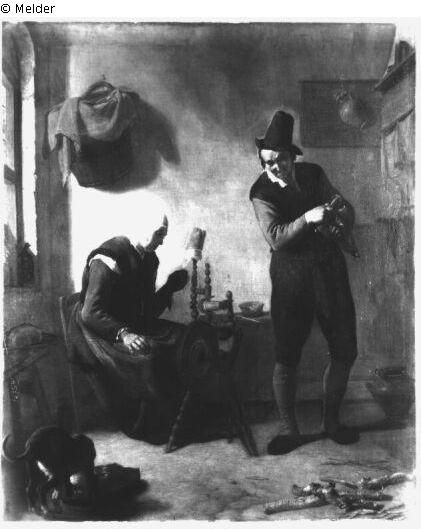 Alte Spinnerin mit einem Bauern in Unterhaltung