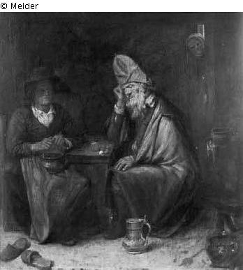 Signiert rechts an der Bank: „IVCR“. Ein altes Paar sitzt am Tisch, während der Tod in die Tür sieht. Der Mann in rotem Rock, blauem Mantel und hoher grauer Mütze hat die Augen geschlossen und den Kopf in die Hand gestützt. Auf dem Tisch vor sich hat er mit Kreide gezeichnet. Die Frau mit breitem schwarzen Hut wärmt ihre Hände am Kohlentopf. Rechts stehen ein Topf auf einer Tonne und auf der Erde ein Zinnkrug. Das Ganze ist etwas trübe, aber farbig ausgeführt;