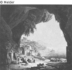 Blick durch eine Grotte, auf die Küste und den Ort. Links im Vordergrund in der Grotte Brunnen und Wäscherinnen. WV: 511.