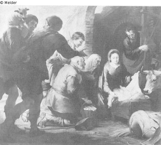 Tafelmalerei: Bild: die Anbetung des Christuskindes durch die Hirten (im Beisein Marias und Josephs); Hirte