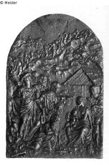 Rechteckige Plakette, oben halbrund schließend. Rechts vor der Hütte sitzt Maria, die das nackte Kind auf dem Knie hält. Rechts neben ihr stehen ein nackter Knabe und Joseph, der sich auf seinen Stab stützt. Von links treten die Könige heran, der vordere kniet in der Mitte vor dem Kind. Er trägt einen langen Bart, und seine Krone liegt vor ihm am Boden. Hinter den Königen sieht man ihr Gefolge und im Hintergrund eine bergige Landschaft mit dem Zug der Könige. Oben links ist der Buchstabe F eingraviert.Die Plakette stammt aus einer Serie von vier unsignierten Plaketten mit Szenen aus dem Leben Christi, zu der auch die Darbringung Christi im Tempel (Nr. 96) gehört. Als Vorbild dienten Antonio Vivarinis Tafeln des Marienlebens von ca. 1445, die sich heute im Wiesbadener Museum befinden; vgl. auch Cesare da Sestos Anbetung der Könige im Museo Nazionale di Capodimonte von Neapel. Die Plakette existiert ebenso mit geradem oberen Abschluß und in profiliertem Rahmen. Sie kommt als Kußtafel in Tabernakelrahmung in der Skulpturensammlung der Berliner Museen und im Louvre in Paris vor, dort mit der rückseitigen Inschrift IHESVS GLORIA IN EXCELSIS DEO ET IN TERRA PAX HOMINIBVS BONAE VOLUNTATIS - FRANCISCVS ET POLIXENA IVSTINIANI M.D.LX. Auf dieser späten Variante ist der Kopf der Madonna ins Profil nach links gedreht. Das Cleveland Museum of Art besitzt ein 1593 überarbeitetes Exemplar mit der rückseitigen Inschrift ANDREAEAIA RDO, ARCHI EPISCOPO BRVNDI SINO, IOANNES BAPTISTA FONTANVS, AVRIFEX, DONO DEDIT A ? DNI ? M ? D ? L ? XXXXIII.