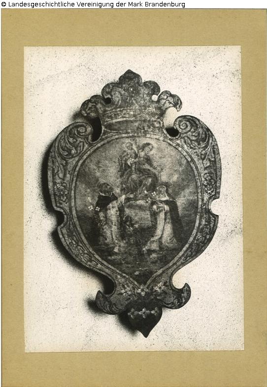 Bekrönte Barock-Kartusche mit ovalem Bildfeld: Vor der Mutter Maria kniend ein männlicher und eine weibliche Heilige in der Ordenstracht der Zisterzienser, beide mit Blütenzweigen. 1909 übernahm das Stadtmuseum Guben Ausstattungsstücke der abgerissenen katholischen Kirche in Schiedlo, das einst zu den Neuzeller Stiftsdörfern gezählt hatte.