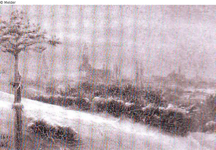 Ansicht einer winterlichen Stadt, eine schneebedeckte Fläche und Hecken liegen zwischen der Stadt Wernigerode und dem Betrachter der von einem Hügel hinab zuschauen scheint, dünner Baum am linken Bildrand. Unten links Signatur und Datum: Helbig 1855