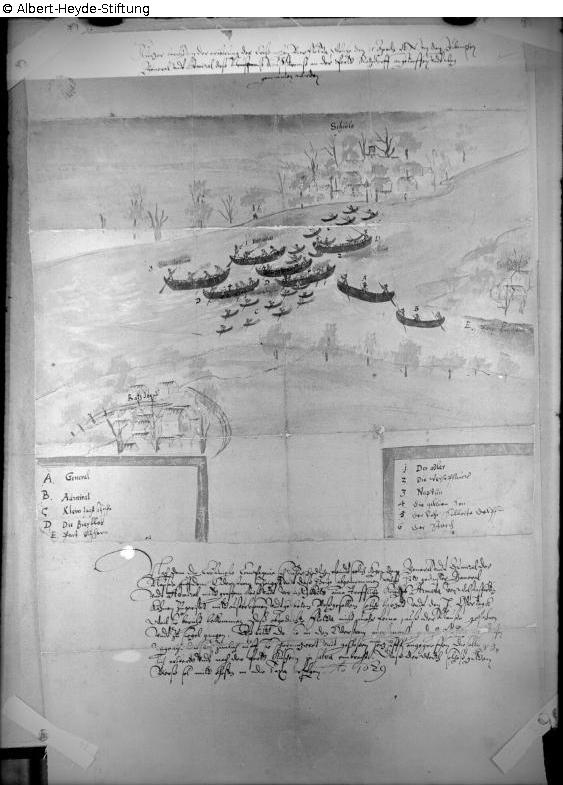 Handzeichnung mit Erläuterungen zum Überfall Gubener Schiffer auf einen Crossener Biertransport bei Schiedlo an der Neisse-Mündung in die Oder. Das Dokument wird im ehem. Gubener Stadtmuseum im "Urkundenzimmer" präsentiert.