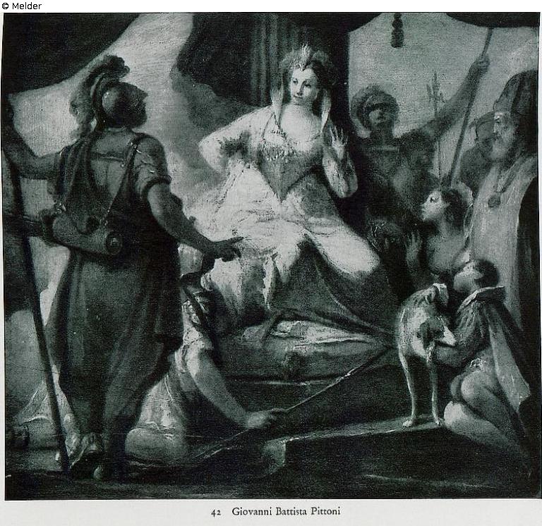 Die beiden Hauptfiguren in theaterhaft übersteigertem Kontrast des Gegenübers, getrennt dabei durch den Keil des schräg einfallenden Lichtes, der durch Hundekopf und Beine des Pagen in dunkelster Bilderecke (rechts unten) befestigt wird. Aus sehr dunklen Rahmungen kostbar das Weiß-in-weiß-Gewoge der Staatsrobe Kleopatras. Als Hintergrund der Kleopatra eine drapierte jonische Säule. Rechts Gruppe von Kriegern und Dienern.