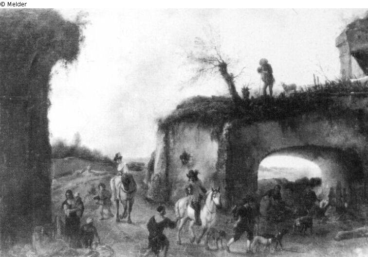 To the right on a road, passing between ruins with an arch, are a gentleman and a lady on horseback accompanied by a hawker with a dog. In the left corner is a woman holding a child and two seated men.