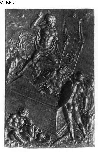 Christus schwebt über dem geöffneten Sarkophag, die rechte Hand hat er segnend erhoben, in der linken hält er die Siegesfahne. Um seinen Körper flattert ein Tuch, das am Hals von einer Agraffe zusammengehalten wird. Links hockt ein schlafender Soldat neben seiner Rüstung, ein zweiter steht rechts in Rückenansicht mit Schwert und Schild. Dahinter sieht man drei weitere Krieger, einer hält einen Speer und einen Schild mit dem Relief eines Skorpions und ein anderer greift nach seiner Rüstung. Links im Hintergrund erkennt man die Felsenhöhle und darüber am Himmel Wolkenstreifen. Kein signiertes Exemplar ist bekannt. Die Rückenfigur des Kriegers gleicht der auf Modernos Kreuzigungsplakette (Nr. 92). Auf manchen Exemplaren fehlen die Wolken.