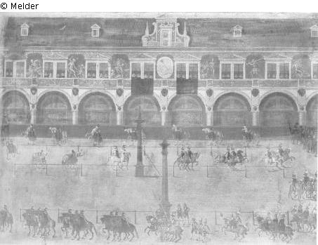 Der Blick ist auf die mittleren acht Arkaden des »Langen Ganges am Stall« gerichtet, in den Fenstern Zuschauerinnen, die Fenster neben der Sonnenuhr mit schwarzen Teppichen behängt. Die Arkade ist mannshoch mit schwarzem Tuch abgespannt. Der Hof ist außerhalb der Turnierbahn mit den Bronzesäulen in weiteren Bahnen abgeteilt, in denen sich paarweise Reiter und von dienern geführte Pferde bewegen. Vorn, an der Spitze des Zuges, Trommler, trompeter sowie Reiter mit Stangen und Lanzen in schwarz-weißer Tracht.