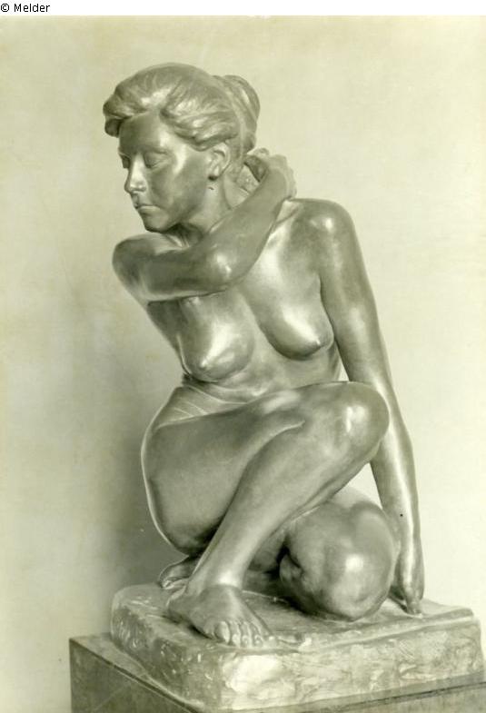 Das jugendliche Weib hockt am boden, die l. Hand aufgestützt und führt die r. Hand mit dem Schwamm über die l. Schulter. Starke verschränkung des auf einen geringen Raum zusammengekrümmten Körpers seinen Gliemaßen.