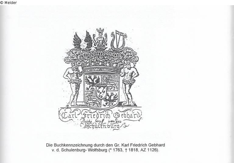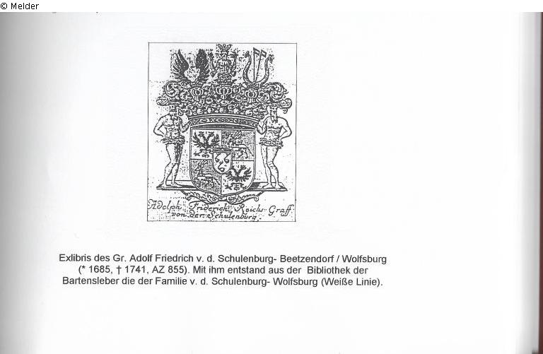 Familie Graf von der Schulenburg, vor 1942 Schloss Wolfsburg (bis 1932 Landkreis Gardelegen, Provinz Sachsen; danach Landkreis Gifhorn, Provinz Hannover; heute Stadt Wolfsburg); danach verbracht in das neuerbaute Schloss Neumühle bei Tangeln, Gemeinde Beetzendorf im Altmarkkreis Salzwedel.