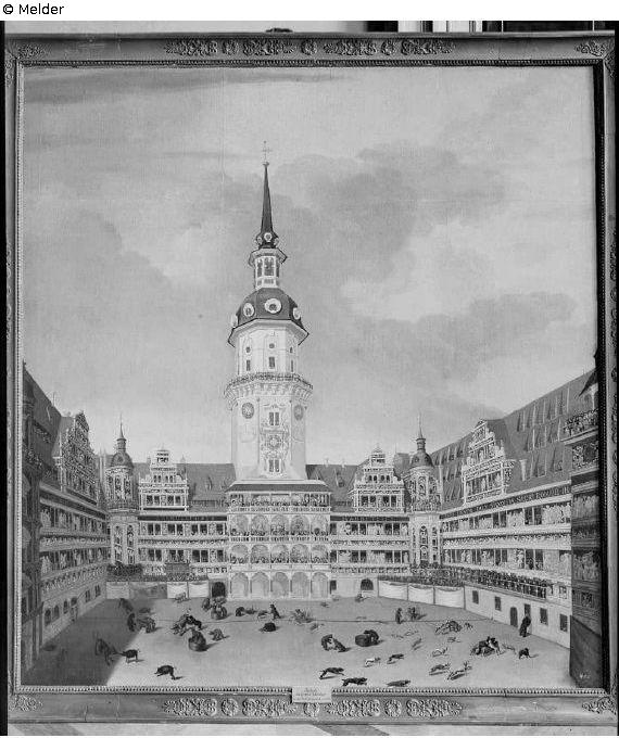 Bärenhatz im Schloßhofe zu Dresden; vergoldeter Rahmen
