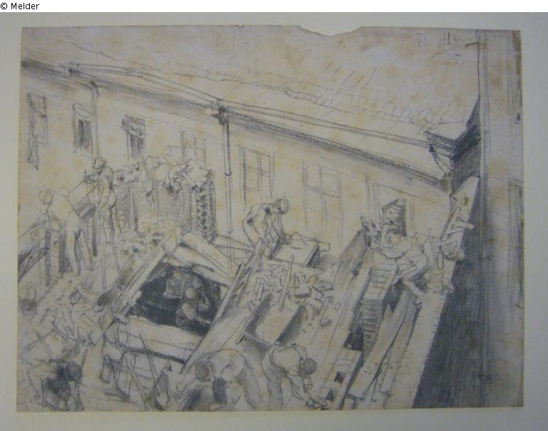 bez. und datiert rechts oben: "Ad. Menzel 75"; Hausbau mit Bauarbeitern bei der Arbeit, von oben gesehen