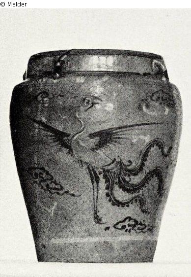 gelblichgraue gefleckte Glasur, unter derselben in Schwarz und Braun Hovogel in Wolken und Blütenzweige. China. Sung, Houan Tys.