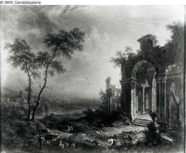Tafelmalerei: Bild: Landschaft mit Ruinen & Berg, hoher Hügel & Fluß & Vieh hüten; Hirt, Schafhirt; Ruine & Hügel & Fluß & Hirte; Hirte