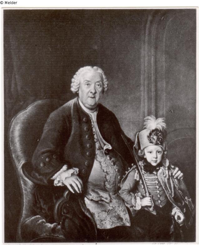 Kniestück; älterer beleibter Herr auf rotem Sessel nach rechts gewandt (Gesicht en face) sitzend, Dunkelgrauer Rock, weiße Spitzenweste, rechte Hand auf die Lehne gestützt, linke auf der Schulter eines kleinen Jungen in roter Husarenuniform mit blauer Attila, der einen kleinen Säbel rechtsgeschultert hält. Hintergrund grau-grünlich-braun, Wandprofile, o. Bez.
