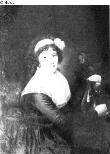 A young woman in a brownish dress and a muslin kerchief on her shoulders, holding a glass vase with flowers. Three quarter length. Turned to the right.