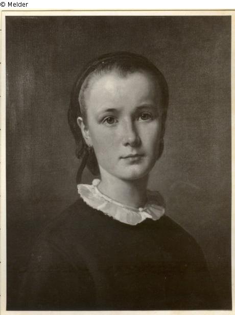 Brustbild eines jungen Mädchens in dunkelgrauen hochgeschlossenen Kleid mit weißem Halskragen; das blonde Haar ist von einem schwarzen, mit blauem Bande zusammengehaltenen Netz gestreckt, Runde Ohrringe