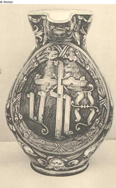 A RICHLY COLOURED LARGE JUG with pear-shaped body, pinched lip spout and bold ribbed strap handle decorated in green and terminating in two yellow cornucopiae, above the mark SP with a paraph across the base, the front of the jug with the Sacred Monogram in grisaille on a rich blue ground within a green wreath with orange border, the sides and base with grotesche motifs in grisaille and colours on a brilliant blue ground, possibly Caffaggiolo, circa 1525