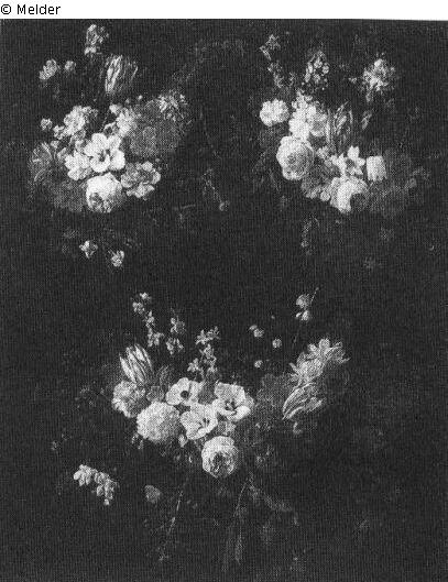 Dreiteiliges Blumenarrangement mit zwei mit verschiedenen Blumen bestückten Gruppen oben rechts und links, die dritte unten in der Mitte; dunkler Grund; Signatur: Nicolaes van vee...daeL fec 1662; Maße: 116 x 92,5 cm