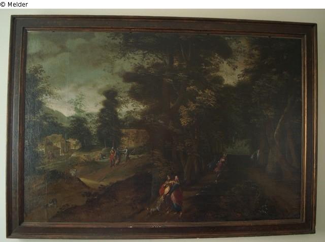 große Waldlandschaft. Im Vordergrund zahlreiche Figuren; auf der Rückseite Aufkleber mit Inventarnummer und Siegel