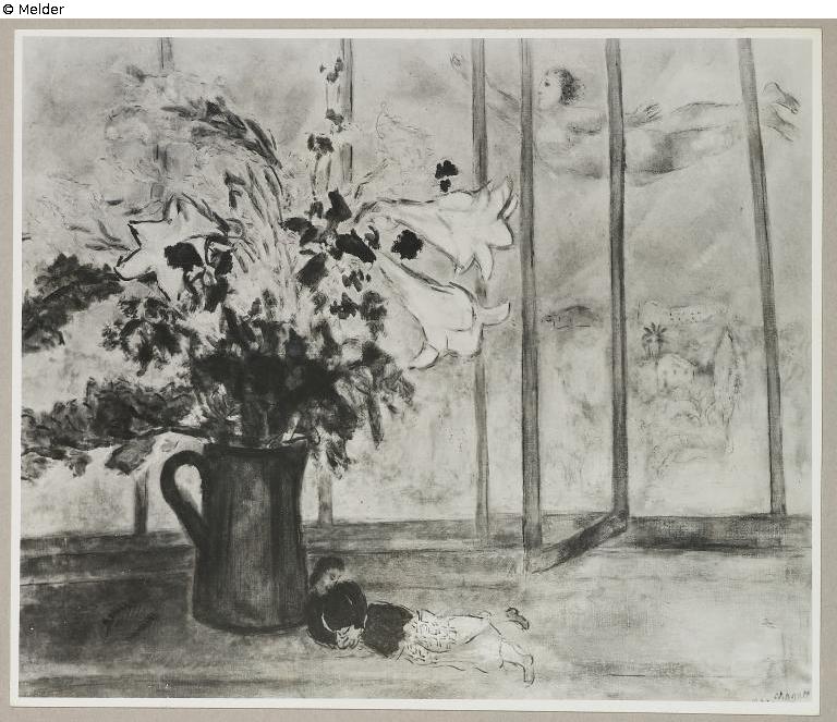 Bouquet de fleurs devant la fenêtre ouverte / Blumenstrauß vor dem offenen Fenster