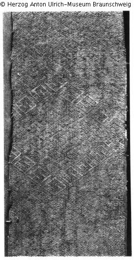 eine in zwei Teilen erhaltene, breite Brettchenborte, ehemals rote, jetzt gelblich verblichene Seide auf silbernem Grund,