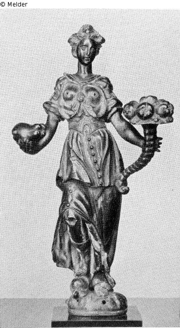 mit dem rechten Fuß auf einen Delphin tretend, in der Rechten eine Frucht, in der Linken ein blumengefülltes Füllhorn haltend. Antike, doppelröckige Gewandung, mit Ährenkrone auf dem Haupt. In den Brüsten, dem Knie und der Delfinschnauze Wasserlöcher. Grünliche Patina.