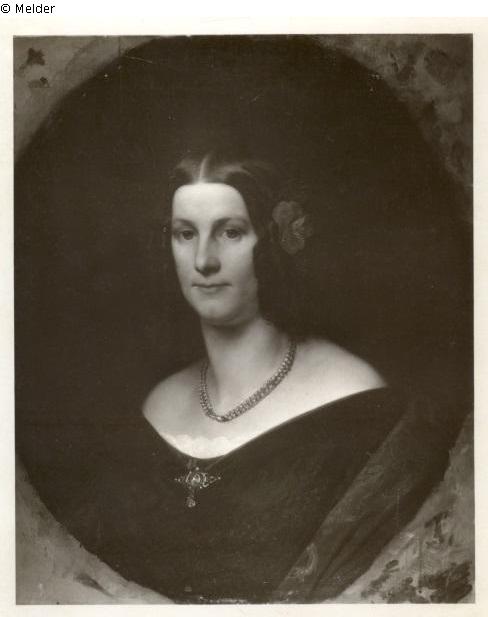 In gemalten beschnittenen Oval. "Tante Julie", Freundin des Hauses Gustav Richter. Blick dem Betrachter zugewandt, schwarzes gescheiteltes Haar, in Locken herabfallend, darin eine rote Rose. Das dekolletierte schwarze Kleid lässt vorn eine weiße Spitze sehen. Goldbrosche mit roten Steinen, dunkelgrünes Tuch mit bunter Borte von den Schultern geglitten