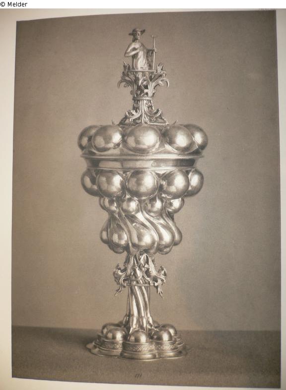 spiralförmiger Buckelgothic-Effekt mit sieben vergoldeten Höckern an der Basis. Oben auf dem Deckel Silberfigur "Christus als Gärtner" (mit Hut und Stab). Unterseite mit zwei gravierten Wappen, Initialen SB und BB.
