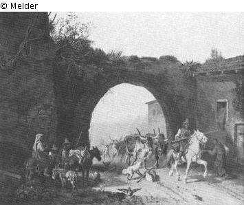 WV 583. Durch einen Ruinenbogen trabt eine Büffelherde, an ihrer Spitze ein berittener Jäger, links halten Landleute mit zwei Pferden und einem Esel
