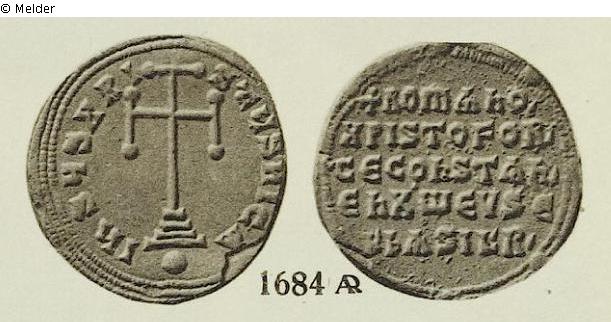 Miliaresion des Romanos I. Lakapenos, Av. Kreuz auf Sockel, darunter Kugel, Legende: IhSuSXRIStuS nICA , Rev. + ROMAnO' / XPISTOFOR' / CE COnSTAn' / En X'W EVSE / b' bASIL' R'. Vgl. Cahn, Frankfurt, Versteigerungs-Katalog No. 75 (1932) Nr. 1684.