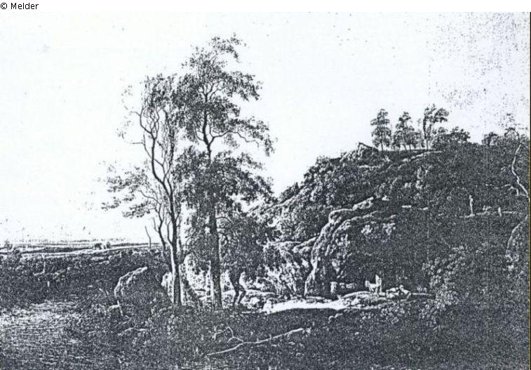Vordergrund dunkel, Himmel in organge-rötlichen Farben, im Vordergrund links Wasser, rechts Kühe und Hirt, dahinter Anhöhe. Bezeichnet: Klengel 1809. Goldrahmen