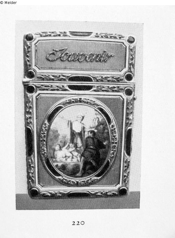 aus guillochiertem Gold, auf blauem Stahlpapier mit Emailornamenten in Lapislazuli Art, Blütenzweigen aus grünem und rotem transluzidem Email und einer ovalen Emailminiatur mit mythologischer Darstellung. Auf der Rückseite unter ovaler Kristallplatte auf blauem Grund die Goldinitialen CM und aus Brillantsplittern die Aufschrift: Souvenir d'amitié. Flache Trapezform, im Innern Elfenbeinplatte. Fermierstempel des Henry Clavel für 1780-89.