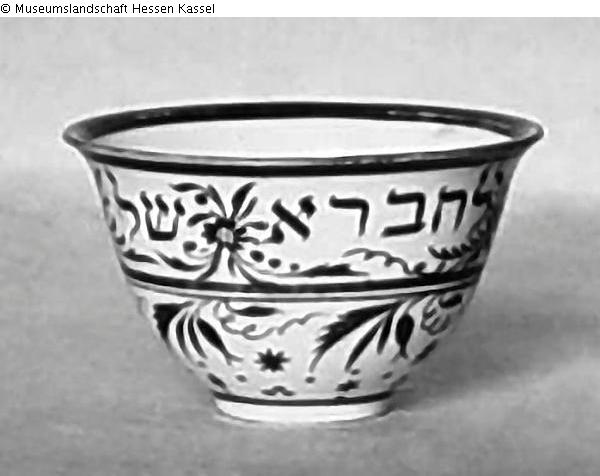 Ohne Henkel, ohne Zeichen. Weiß mit Goldmalerei und hebräischer Inschrift: "Lechevroh schel tikum chazott" [Lakhevra shel tikun chatzot].