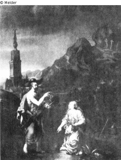 In a mountainous landscape with high tower to the left is Christ in a red cloak and in a widebrimmed hat, with a spade in his hands. Before him is Mary Magdalen on her knees with a myrrh jug in her left hand.