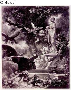 Die erwachende Venus in einer Landschaft. Allegorisch Wasser, Erde, Feuer und Luft.