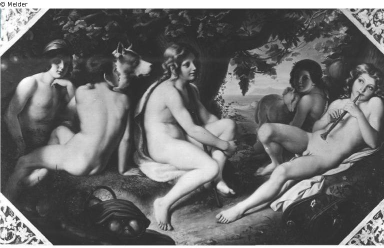 Bez. li unten: J H 1848; Fünf halbnackte Hirtenknaben zwischen Blumen und Früchten unter weinumrankten Bäumen. Rechts liegt einer der Knaben, die Flöte blasend, an einen Buchenstamm gelehnt. Neben ihm liebkost ein jüngerer ein Lamm. In der Mitte lauscht der dritte. Links am Quell der vierte, der einen großen Hund streichelt, der fünfte mit roter phrygischer Mütze. Hinten rechts die sonnige Meeresbucht.