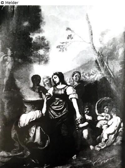 In der Mitte des Bildes befindet sich eine weibliche Figur, umgeben von zwei anderen Frauen und drei Putti. Vor ihr kniet eine (vermutlich) männliche Figur, die ein dampfendes Gefäß über seinem Kopf hält und es der weiblichen Mittelfigur überreicht. Links und rechts von der Menschengruppe sind Bäume abgebildet.